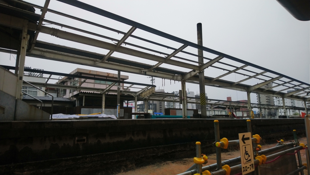 高架ホームを観察します。この日は雨が降っていて、ホームで待っていても雨が入ってきてしまいます。もうちょっと屋根をどうにかできなかったのか…↓