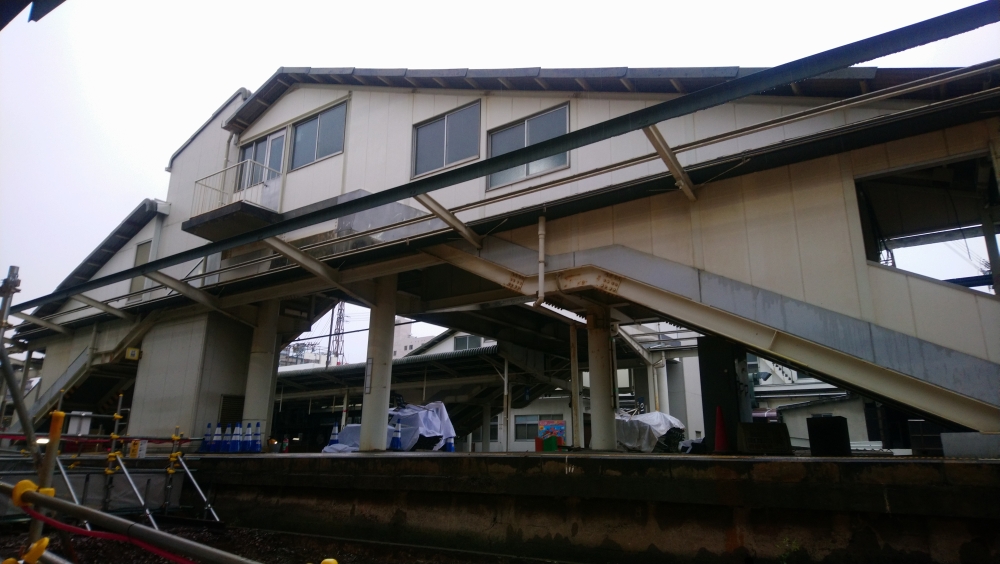 自動改札機化された改札を出ると旧ホームを経由して駅前に出ることになります。ところが傘を持っていなかったので弱まるまで旧ホームが見えるところで待っていました↓
