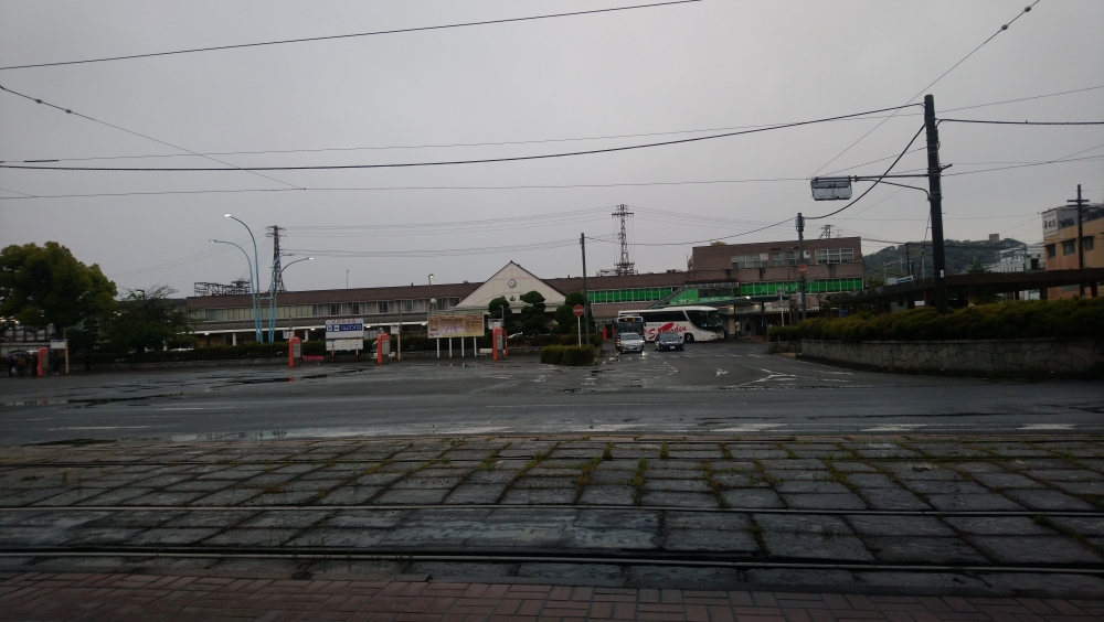 今回のホテルはJR駅から離れているので路面電車に乗ります。電停から見た松山駅↓
