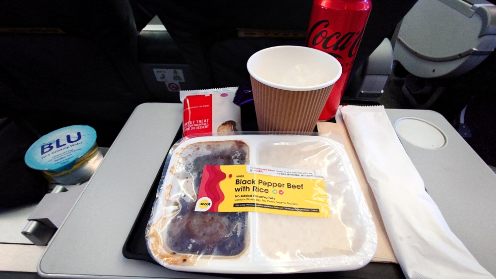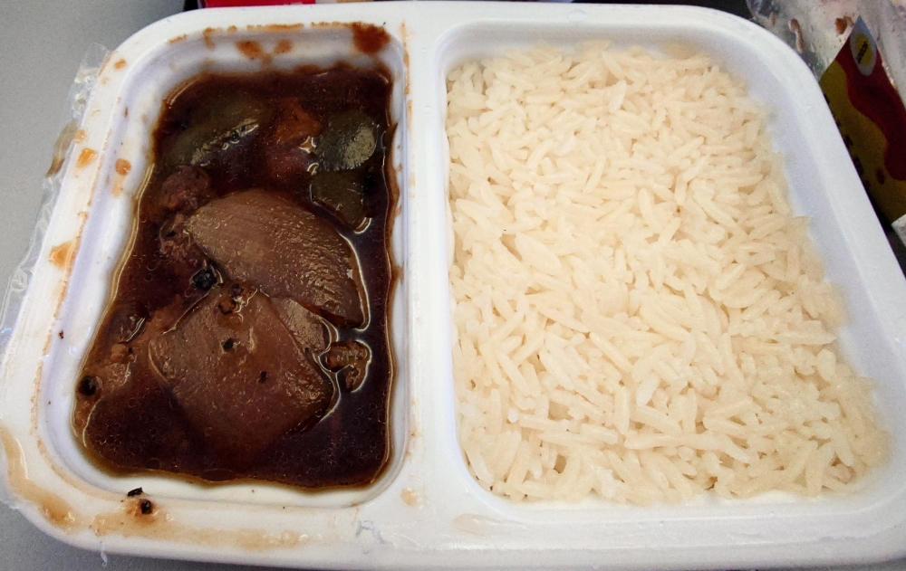 機内食は前回と同じ牛肉の黒胡椒炒め。しょぼく見えるけど味はそこそこ美味しいと思う↓