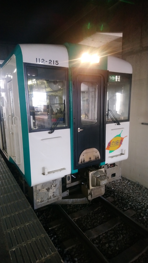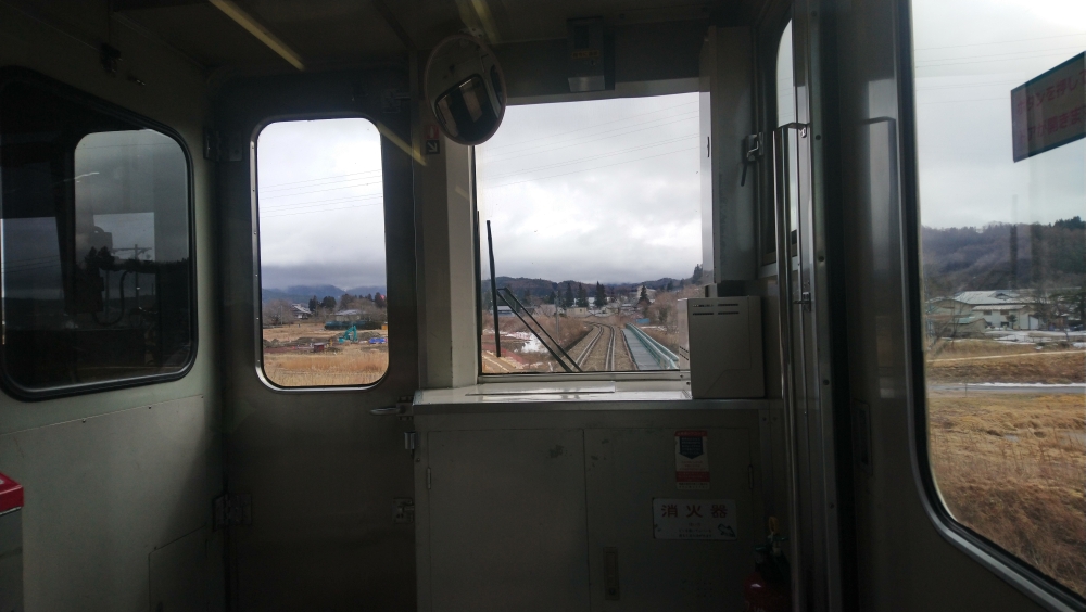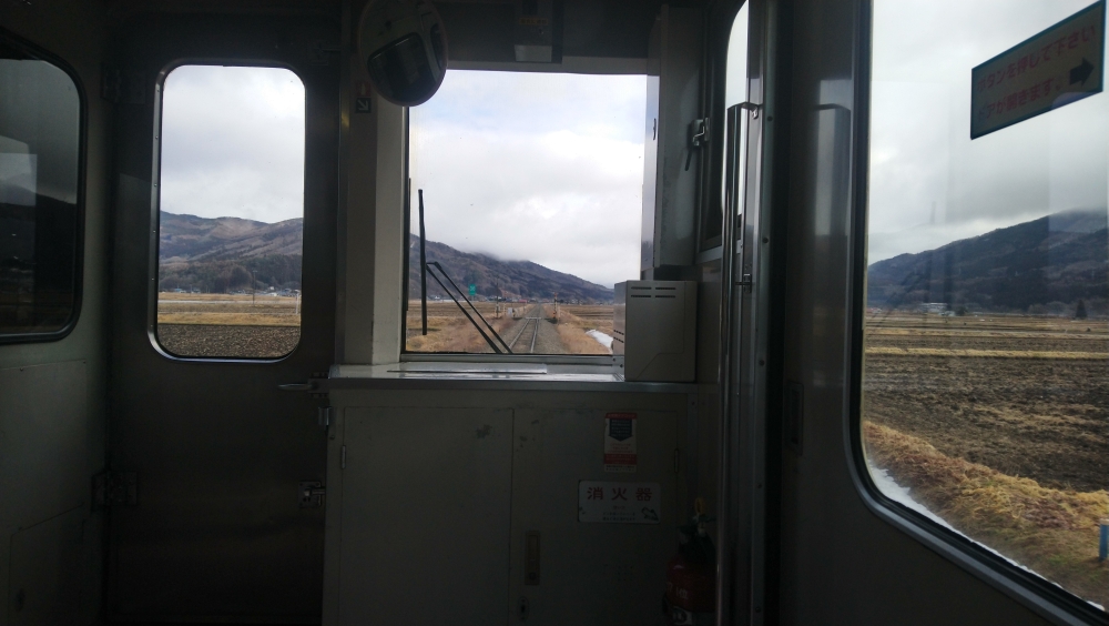 遠野からはキハ100系単行に乗ります。キハ110より短い車両ですね。一番後ろのロングシートだけ空いていたので着席して後ろを眺めていました↓