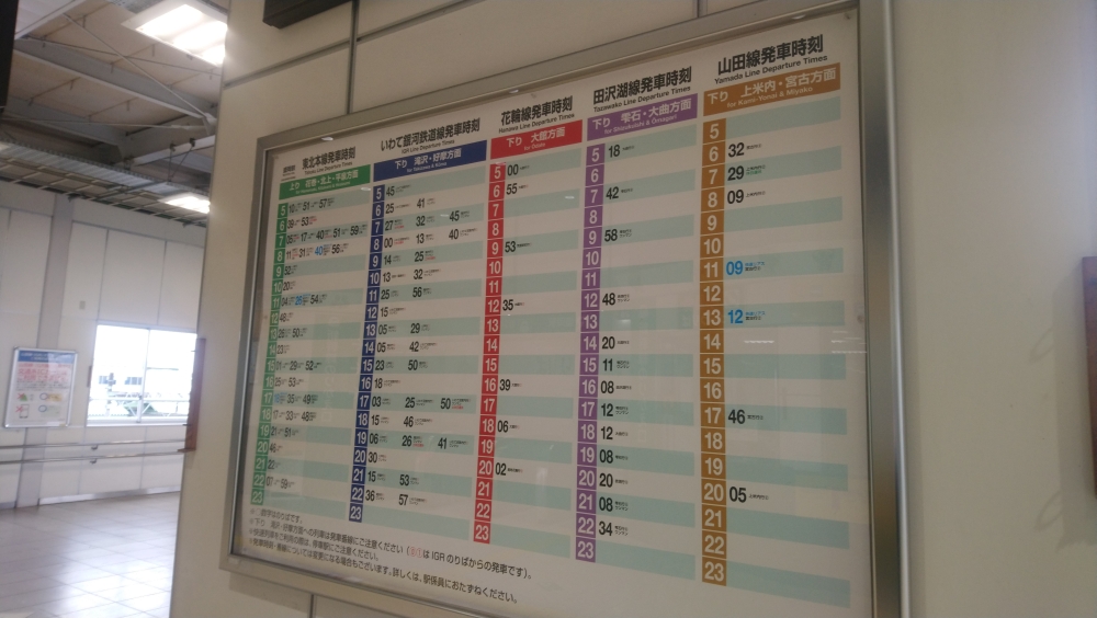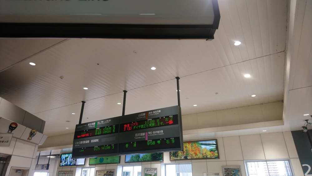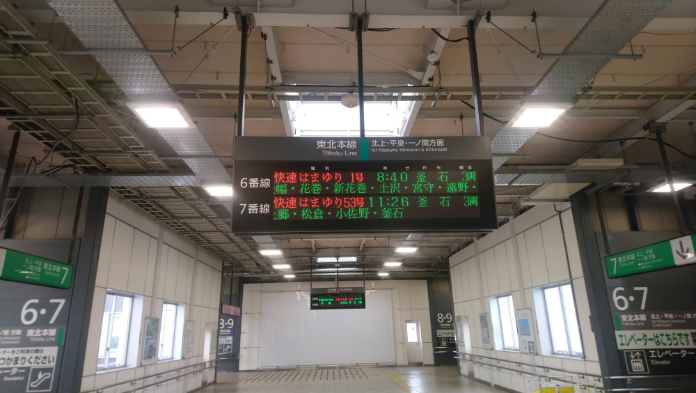 盛岡からは東北本線を上って一ノ関まで向かいます。一ノ関行はやはり701系でした。一番後ろに座っていると運転席の速度計が見えますが、110km/h出しまくっていました。車掌がきっぷの回収をしており、それに時間がかかって遅れが出ていて飛ばしていました。それでも一ノ関駅には数分遅れて到着。